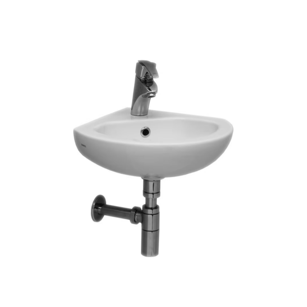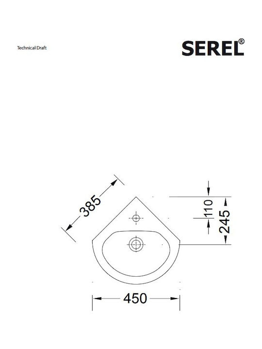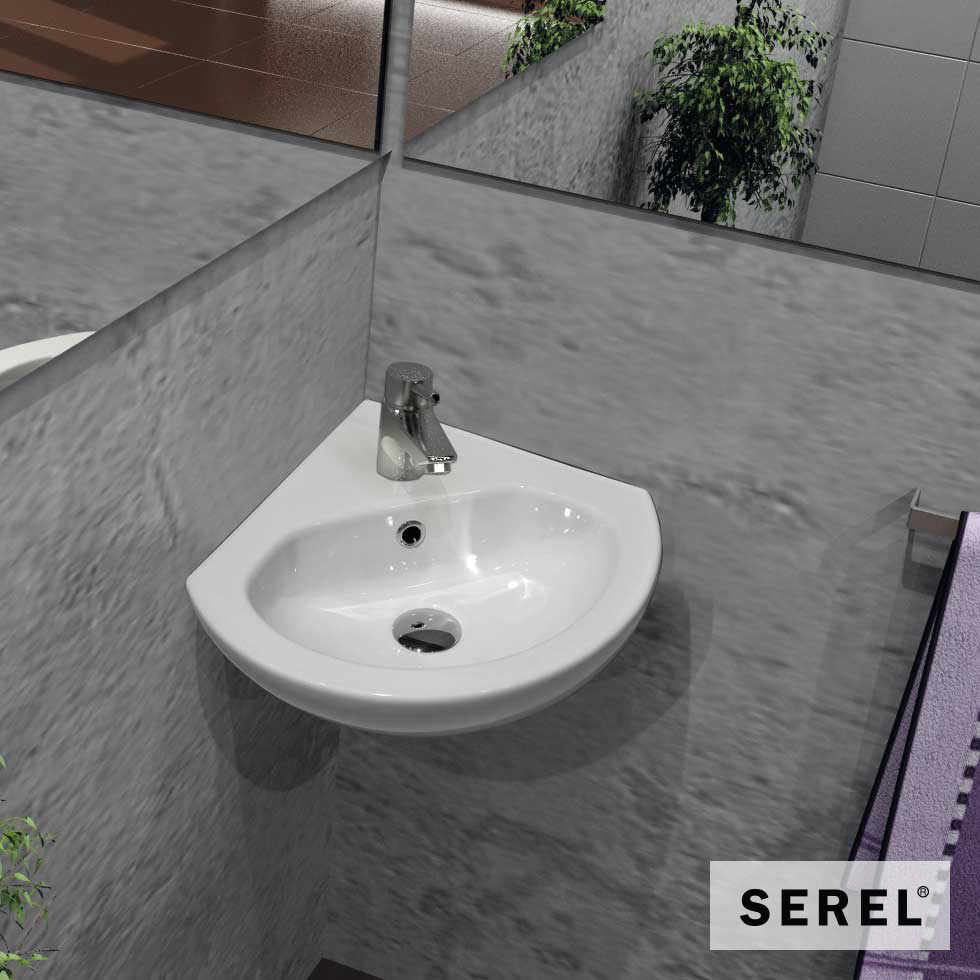 Κρεμαστός νιπτήρας μπάνιου γωνιακός από πορσελάνη της εταιρείας Serel, με οπή για μπαταρία. Αποτελεί ιδανική λύση για εξοικονόμηση χώρου σε μικρά μπάνια.