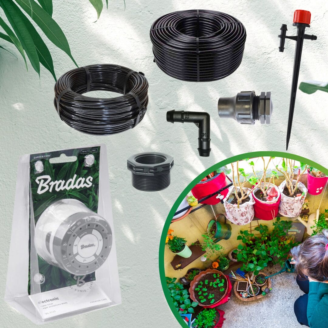 Ολοκληρωμένο σύστημα αυτοποτίσματος που περιλαμβάνει σωλήνες, σταλάκτες και αξεσουάρ. Ιδανικό για κάθε κήπο ή μπαλκόνι.